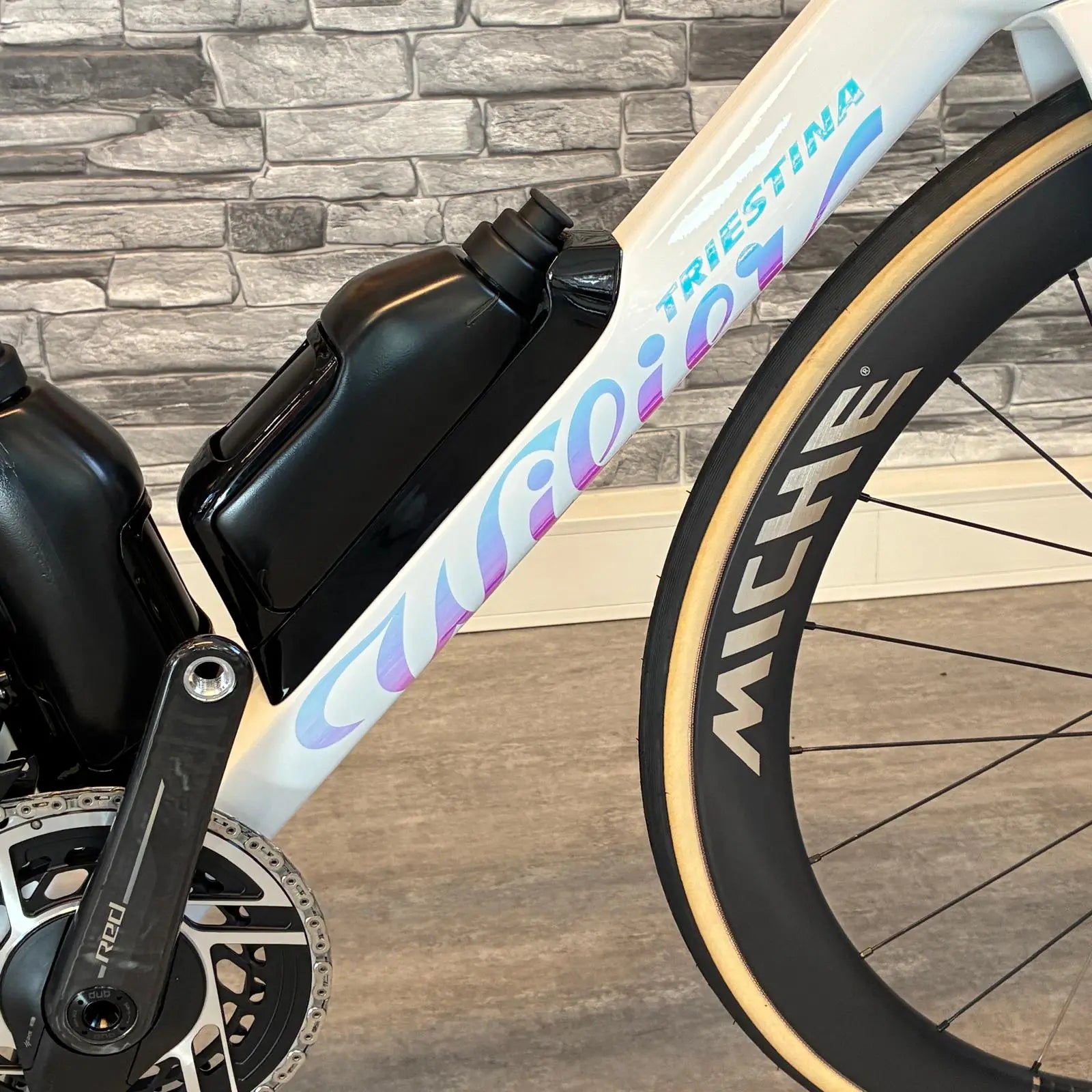 - Aero-optimierter Rahmen mit integriertem Flaschen- & Halter-System (Aerokit)